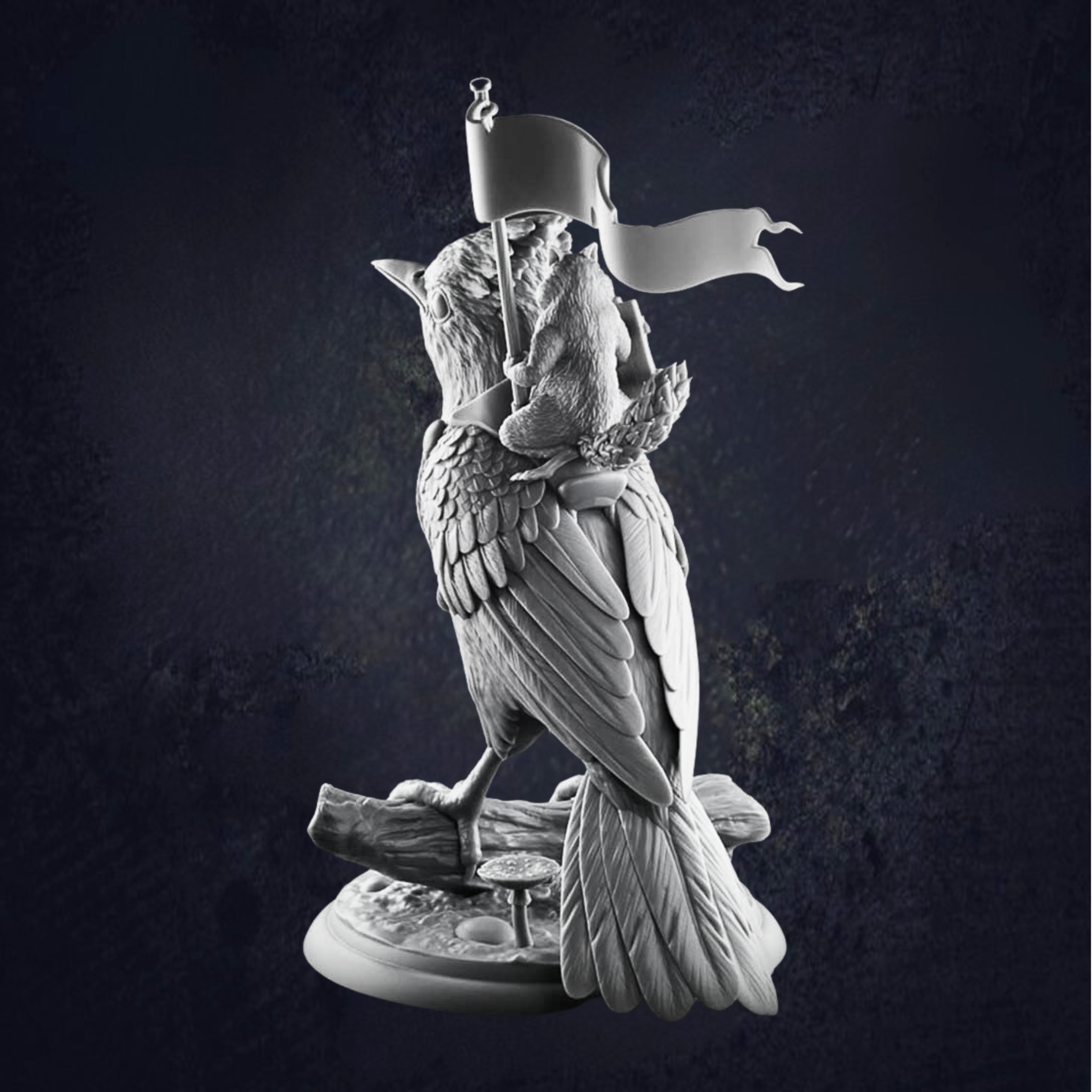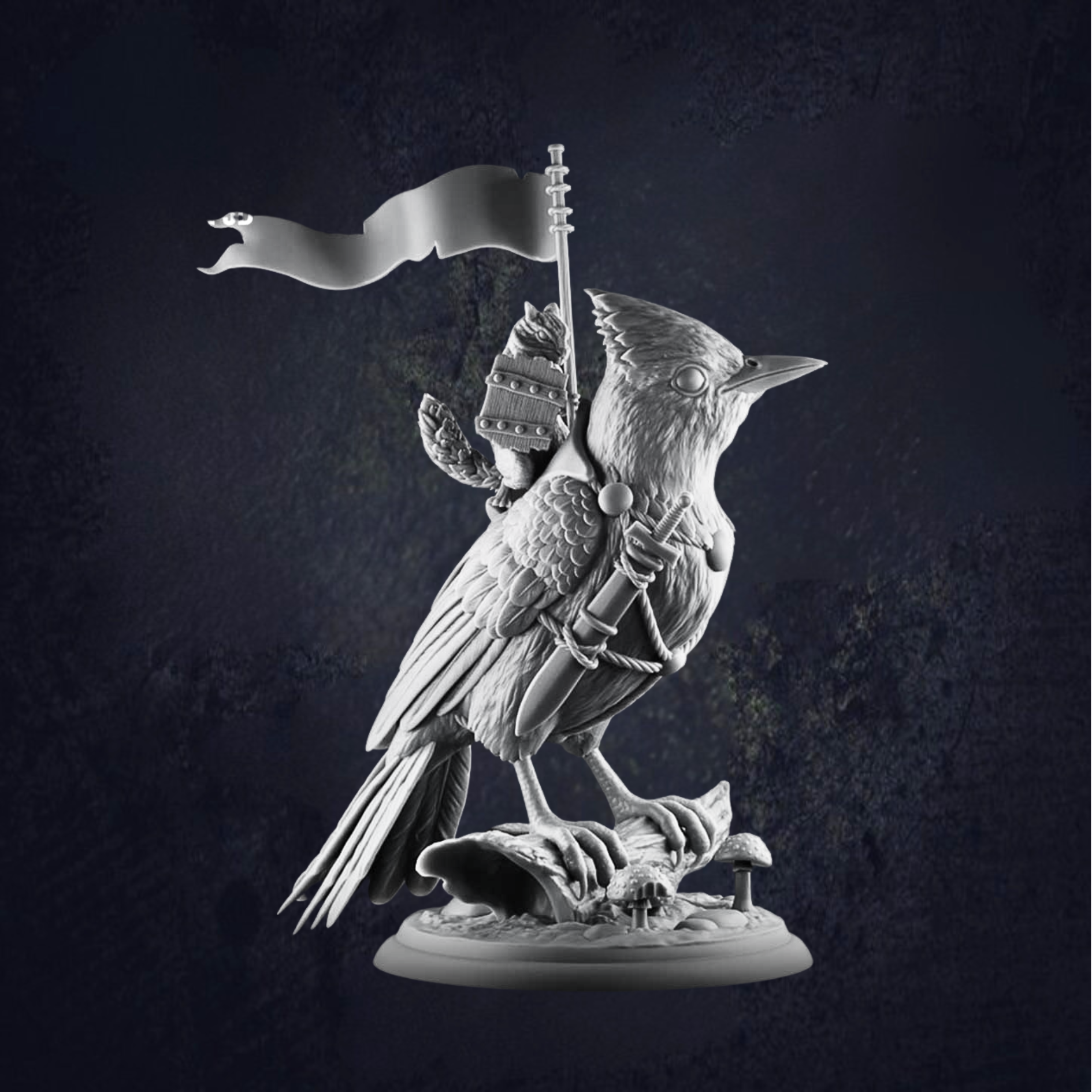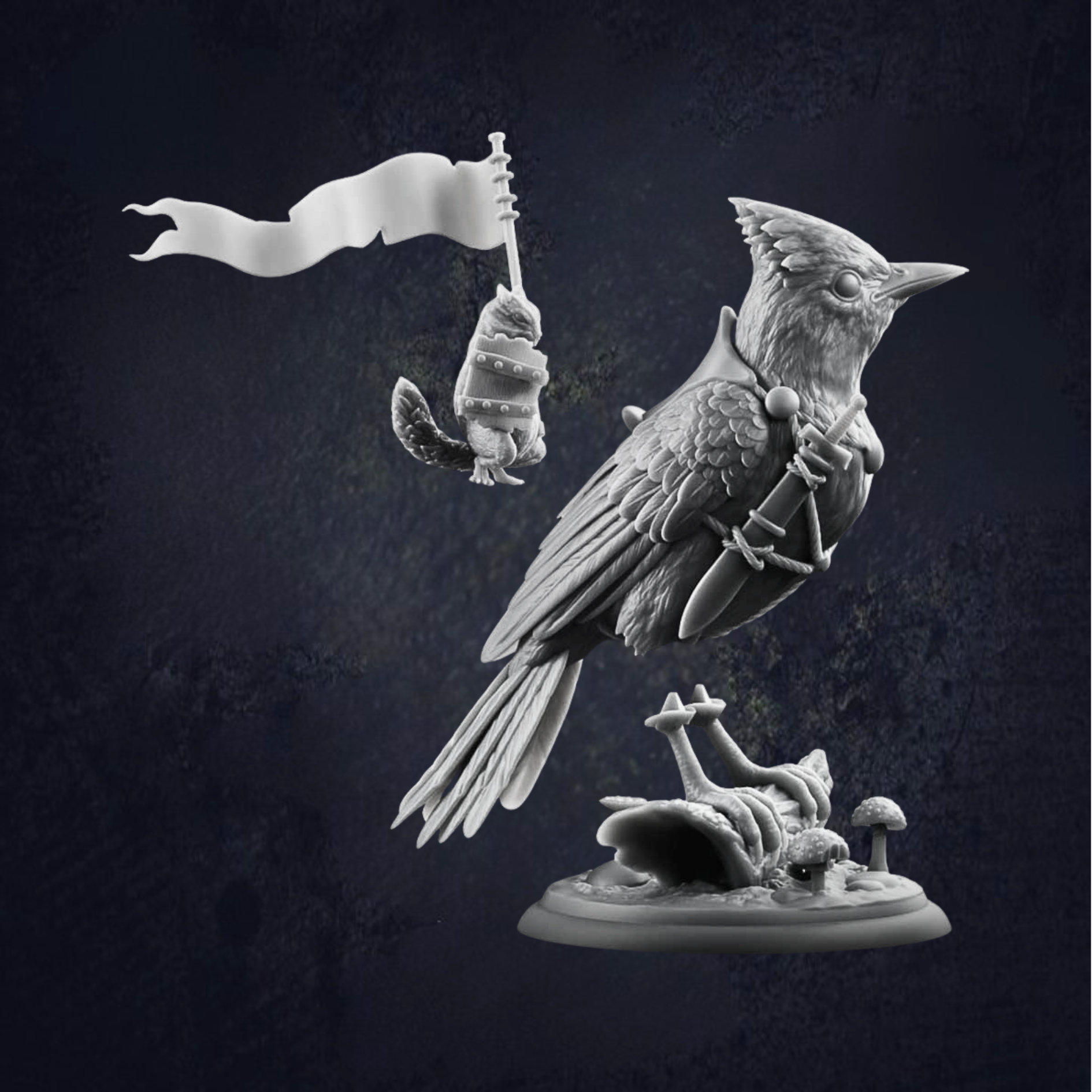 A characterful woodland duo featuring a chipmunk rider mounted on a grounded blue jay, carrying a shield and small flag. This charming miniature suits light-hearted fantasy RPG campaigns, working well as a woodland scout, messenger, banner bearer or quirky player character for adventures in forest and nature-themed settings.