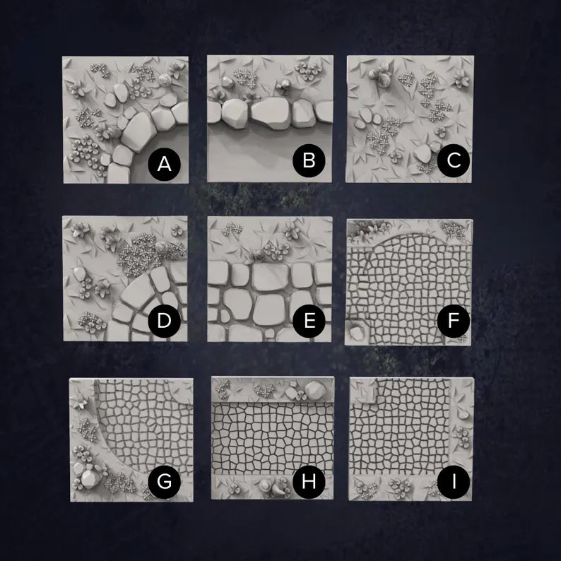 Build vibrant fairgrounds and magical event spaces with these Carnival Tiles, modular 50mm x 50mm terrain pieces designed for fantasy tabletop RPGs. Available in cobblestone, path, and pond designs, these tiles are perfect for creating carnival plazas, travelling fair sites, festival paths, market squares, or whimsical Feywild settings in DnD and fantasy RPG campaigns. Use preset tile sets for quick table setup or mix and match individual tiles to craft custom layouts, from lively celebrations to eerie, abandoned fairgrounds with a darker twist.