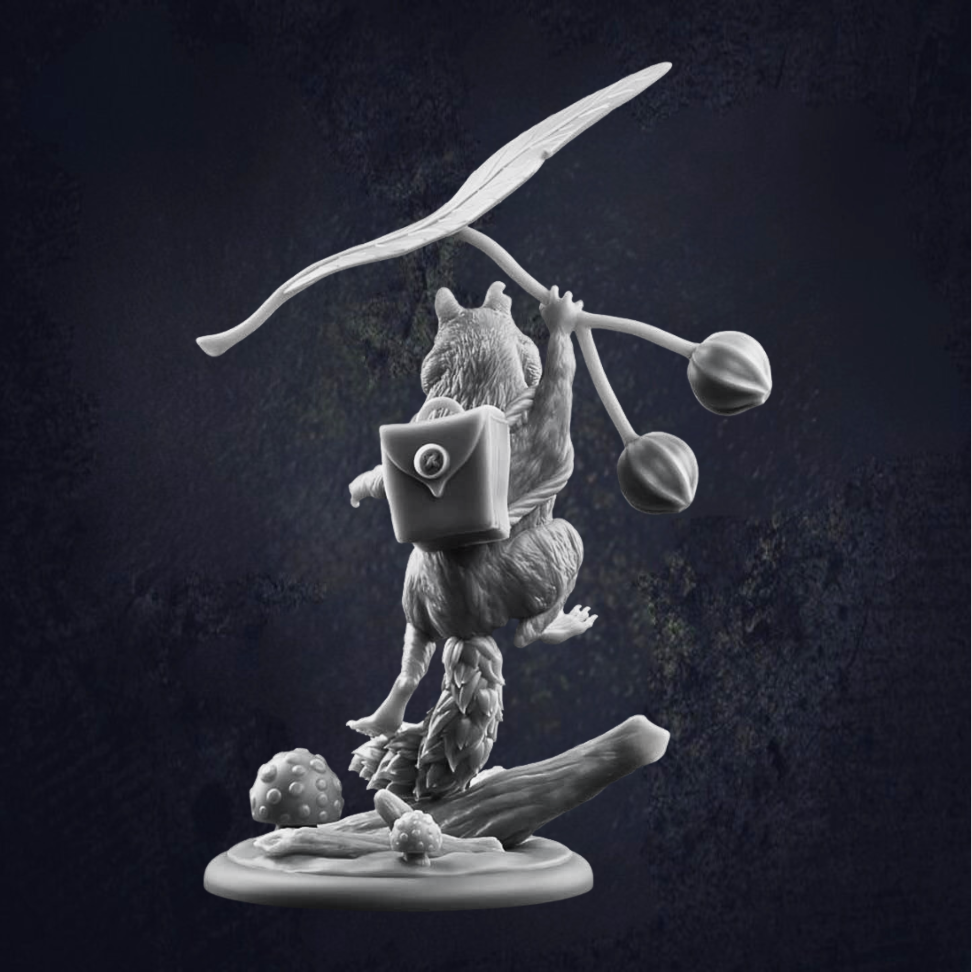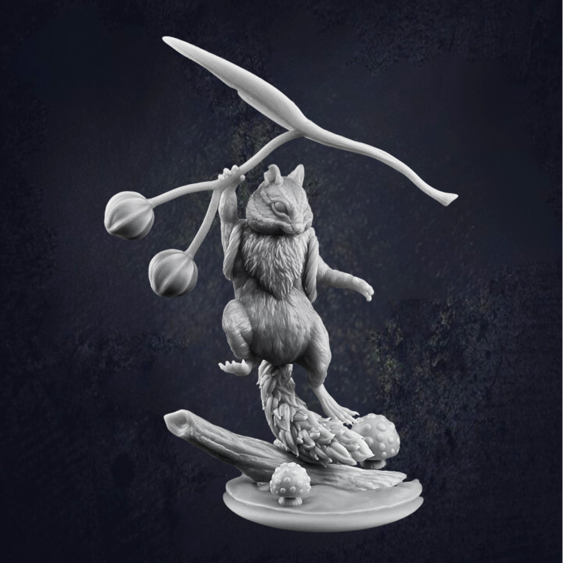 A lively humanoid chipmunk adventurer captured mid-leap, balancing on its tail while lifting a branch with two berries overhead and wearing a small backpack. This characterful miniature fits perfectly into woodland encounters, whimsical fantasy settings or light-hearted RPG campaigns, working well as a forest scout, druid companion, travelling critter NPC or unusual player character.