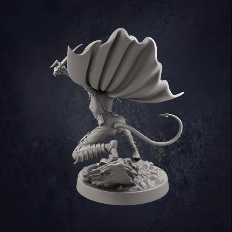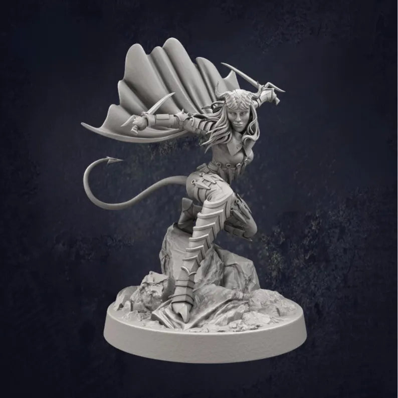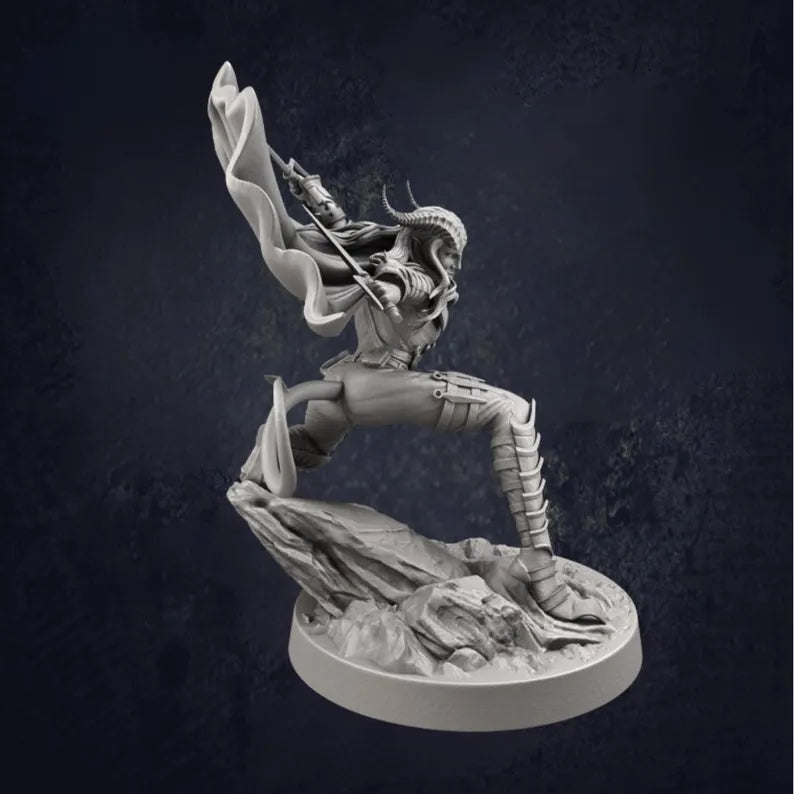 Ellith is a crouched tiefling rogue captured mid-movement, poised for stealth, infiltration or a well-timed strike. She suits urban campaigns, thieves’ guild storylines and character-led DnD adventures where subtlety matters more than brute force.